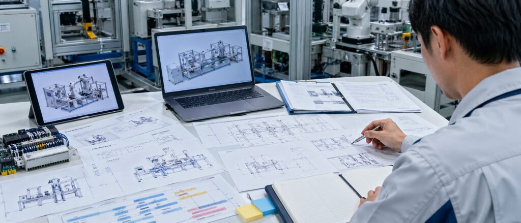 設備づくりでは、設計、製作、組立、ロボットティーチングなど、複数の工程が関係します。